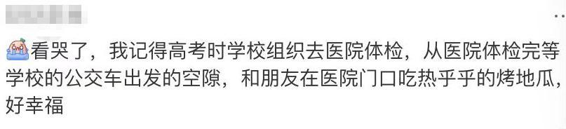 有的是高考体检,等校车的间隙和朋友一起在医院门口分享的烤红薯,是“恰同学少年”久久不变的同窗情谊;