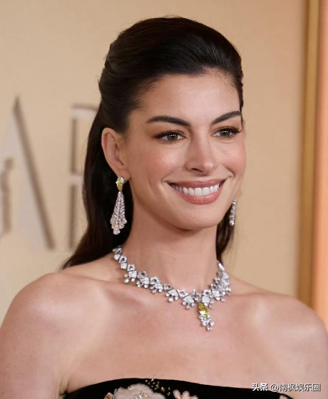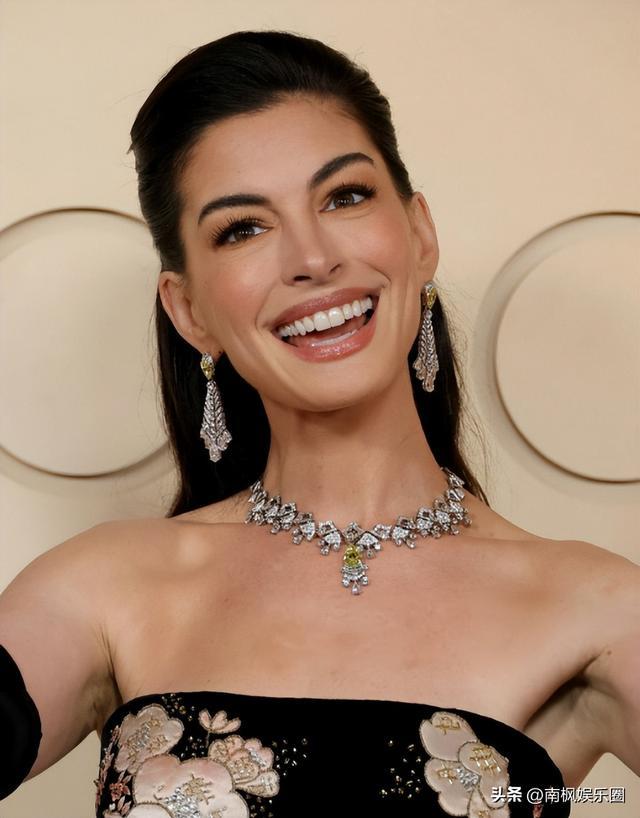 安妮·海瑟薇这一身黑色印花抹胸礼服,华丽高贵,还颇有中国古典美人的风韵。