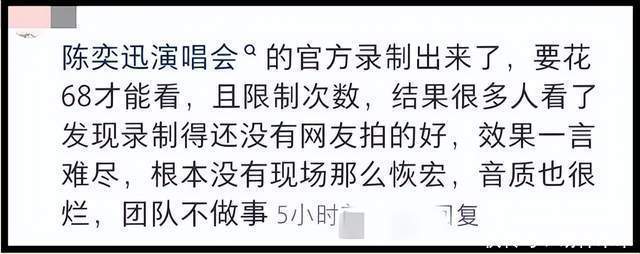 据悉,这张专辑的内容是陈奕迅演唱会的高光集锦,线上售价为68元,且有观看限制次数。但不少粉丝在观看后发现,该专辑的录制效果很差,不仅封面难看,画面还晃动的厉害,甚至不如粉丝现场拍摄的效果好。