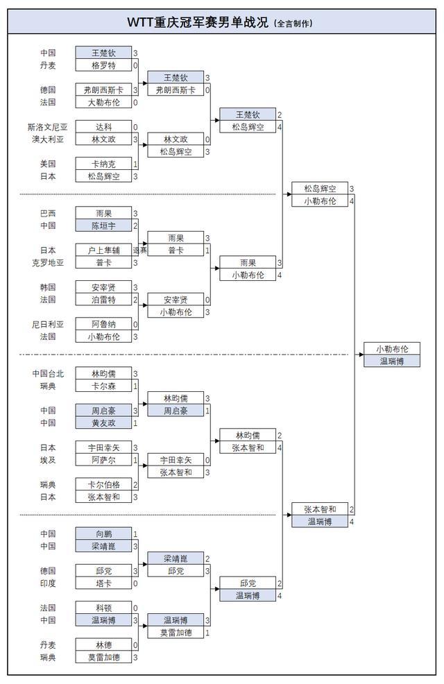 最终国乒只有年仅19岁、世界排名第二十七的小将温瑞博一路过关斩将独闯4强,先后以3-0胜法国新星科顿、3-1胜瑞典奥运亚军莫雷加德、4-2胜德国欧洲冠军邱党,随后半决赛4-2淘汰日本劲敌张本智和晋级最后一轮,最终与连续4-3逆转巴西世界冠军雨果、日本全国冠军松岛辉空的法国主力小勒布伦(世界排名第六)争夺冠军。
