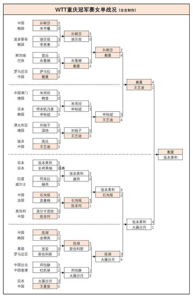 更早结束的女单项目国乒也遭遇重创,首轮世界排名第二的王曼昱爆冷0-3惨败不敌日本的大藤沙月止步32强,第二轮陈幸同1-3输队友石洵瑶止步16强,第三轮世界排名第一的孙颖莎2-4输队友蒯曼,此外陈熠也3-4输大藤沙月、石洵瑶2-4输另一位日本选手张本美和止步8强,国乒女单上半区由此而失守,张本美和半决赛4-1胜队友大藤沙月过关。